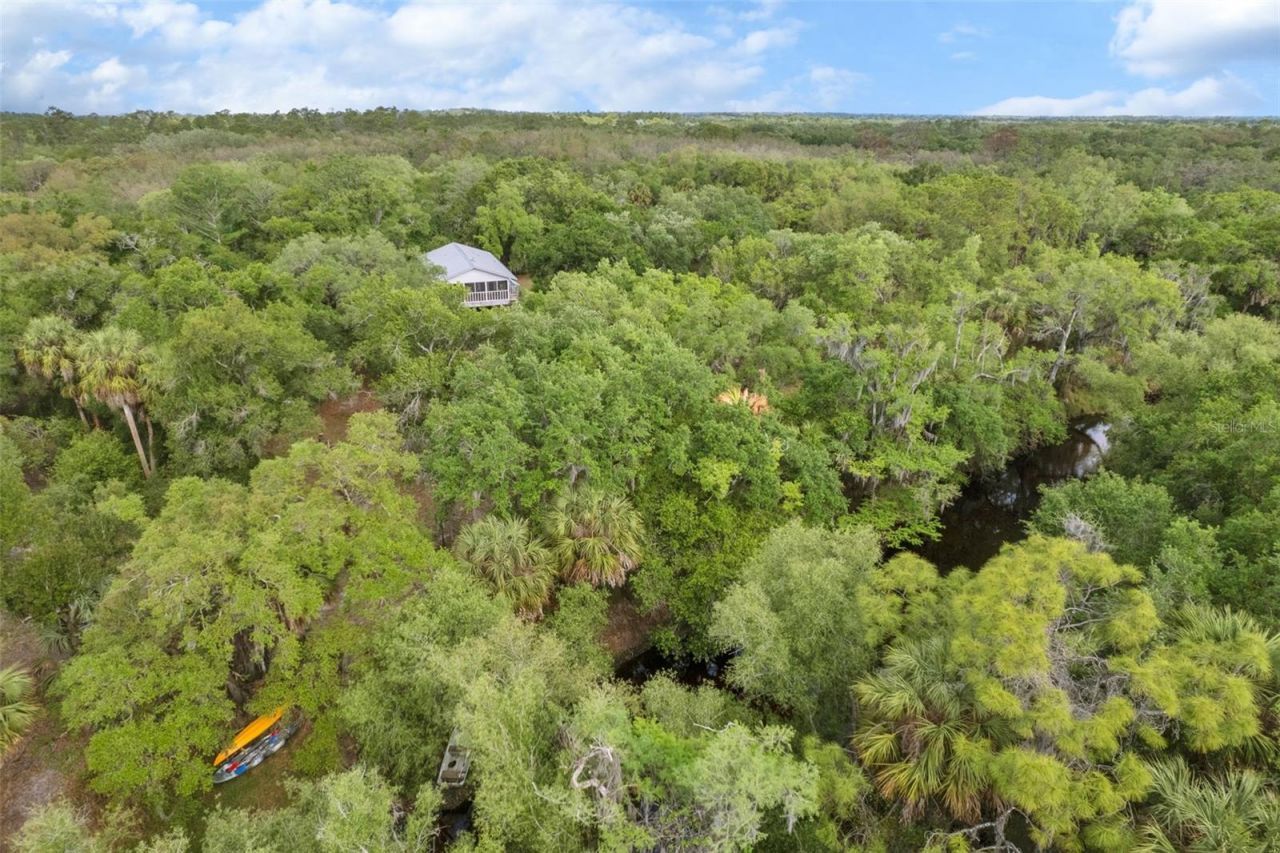One or more photo(s) has been virtually staged. Set on approximately 5 acres of private land with over 600 feet of creek frontage and direct water access, this elevated 3-bedroom, 2-bath home offers a lifestyle that is increasingly hard to find. It is the kind of place you come home to and instantly feel the shift, where your backyard becomes your retreat, your playground, and your reset at the end of every day. With direct creek access, you can kayak or paddleboard right from your backyard and enjoy true outdoor living. Start your mornings with soft light filtering through the trees, and end your evenings with Florida sunsets that glow orange through the landscape. Wind down by the fire pit under star-filled night skies and experience a sense of peace that is hard to find anywhere else. Surrounded by cypress trees, mature oaks, native Florida wildlife, and open space, the setting feels both peaceful and completely your own. Time slows down here, whether you are birdwatching, exploring the land, or simply soaking in the quiet surroundings. It is a place that draws you into the moment. The screened-in patio offers year-round outdoor living, perfect for relaxing and taking in your private natural surroundings. The elevated design adds both character and function, offering a treehouse-like vantage point along with covered space below that is ideal for gatherings, entertaining, or hosting barbecues. With over 650 feet of creek frontage, the property is ideal for fishing, fossil hunting, and exploring. The surrounding land creates your own private retreat with plenty of room for boats, RVs, ATVs, and all your outdoor toys. Open areas provide space to roam, ride, and enjoy the outdoors in a way that feels natural and unconfined. This property is ideal for those seeking a more intentional lifestyle. Whether it is unwinding on the creek after work, tending to your garden or homestead, or gathering around a fire under the stars, every element here supports a slower, more connected way of living filled with opportunity. Inside, the home feels cozy, updated, and like a true escape. The home features two beautifully updated bathrooms, including a fully remodeled main bathroom with a deep soaking tub and a renovated primary bathroom with a thoughtful, custom design aesthetic. Recent updates include updated lighting, ceiling fans, new screening, and a farmhouse kitchen sink, along with fresh interior paint, creating a clean, move-in ready feel. A place to slow down, reconnect, and live in the moment. Come walk the property, take it all in, and feel what makes this place so special.